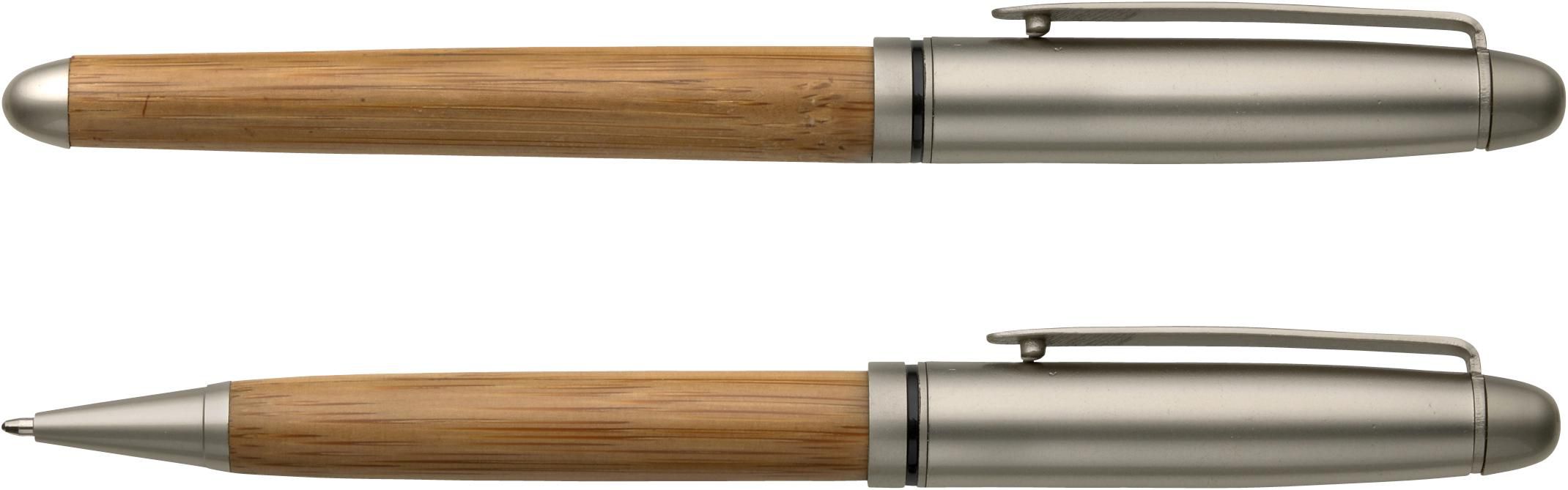 Parure in bamboo, penna a sfera e rollerball, comodo astuccio, refill blu