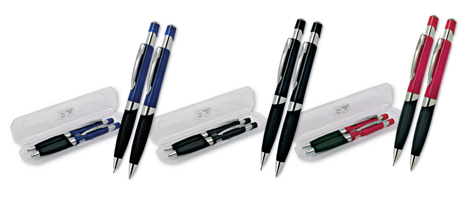 Parure composta da penna a sfera a scatto e mina, realizzata in ABS colorato con impugnatura nera gommata e particolari cromati. Viene fornita in un astuccio bianco trasparente, ideale per un uso quotidiano o come regalo.