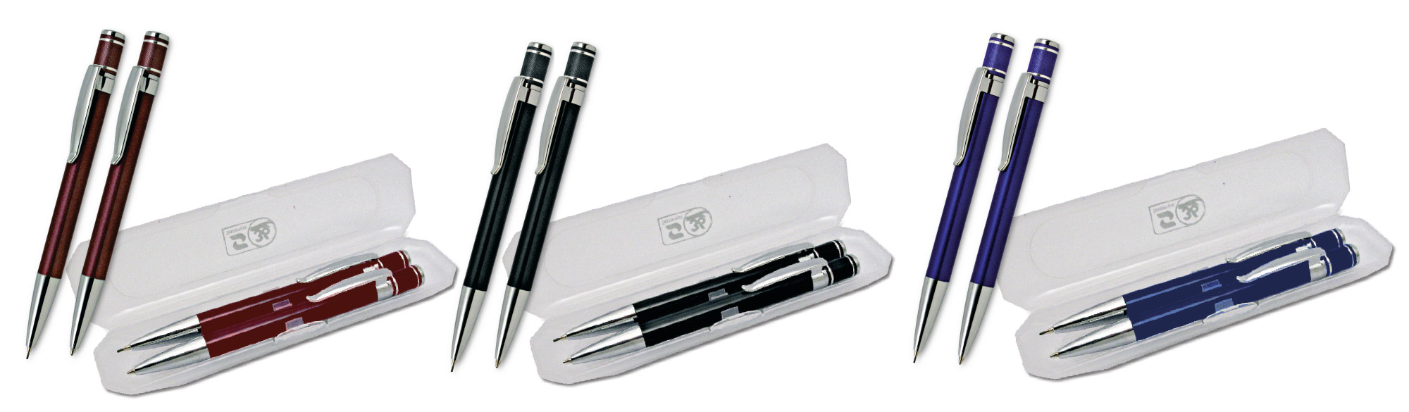 Parure composta da penna a sfera e mina a rotazione, realizzata in alluminio colorato con clip cromata. Include un refill nero a triplice carica e viene fornita in un astuccio bianco trasparente, rendendola un'ottima scelta per chi cerca un set di scrittura elegante e pratico.