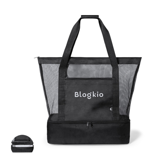 Borsa in resistente poliestere 600D RPET plastica riciclata per incoraggiare il riutilizzo dei rifiuti plastici e contribuire alla sostenibilità del pianeta. Scomparto principale in rete tipo mesh, con chiusura a zip. Borsa termica integrata nella base, in resistente poliestere 600D RPET, con interno isotermico in PEVA. Maniglie di trasporto rinforzate e grande tasca frontale, con etichetta RPET.