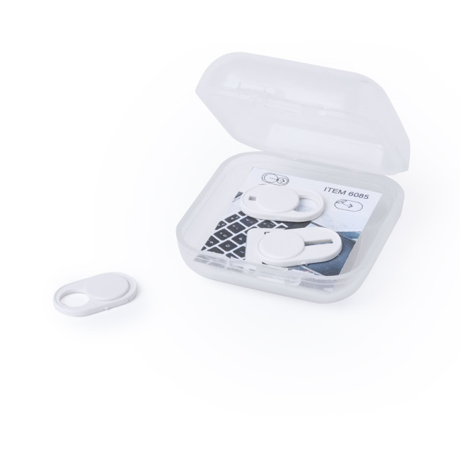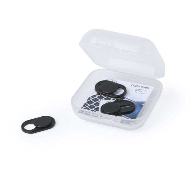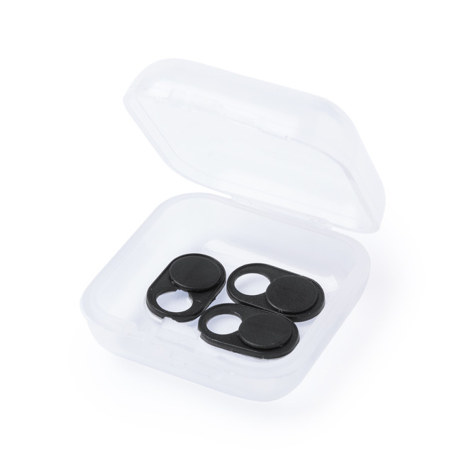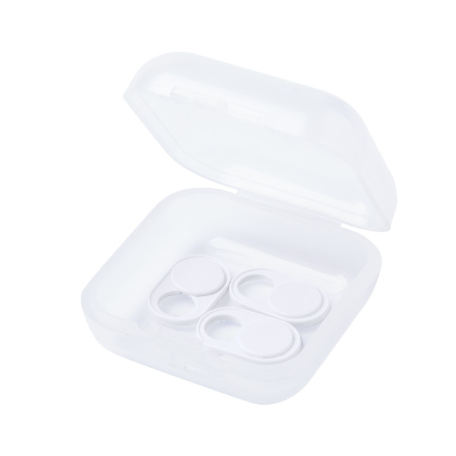 Copertura per fotocamera di dispositivo mobile per proteggere la privacy. In formato ultra compatto e servita in astuccio individuale semitrasparente con 3 pezzi. Disponibile nei colori bianco e nero, set presentato in polybag con cartoncino di design.