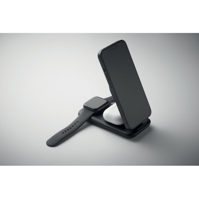 Stazione di ricarica 3 in 1 in ABS con caricatore magnetico wireless da 15 W, supporto per il telefono, caricatore TWS e caricatore per smartwatch (solo Apple®). Compatibile con iPhone® 12 e successivi. Anello metallico magnetico aggiuntivo.