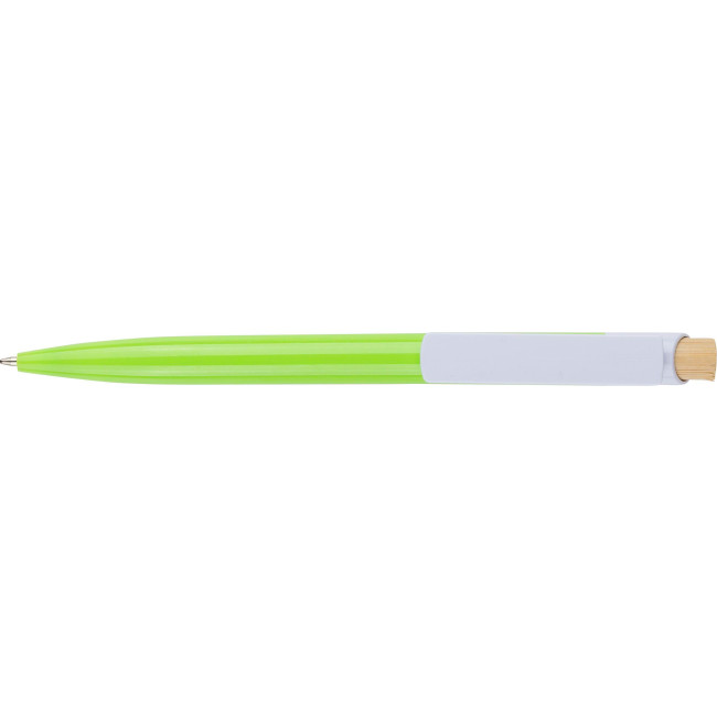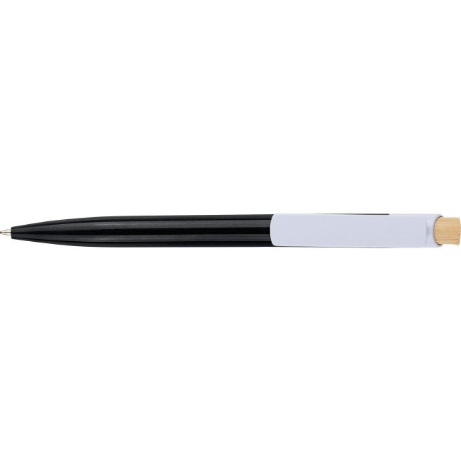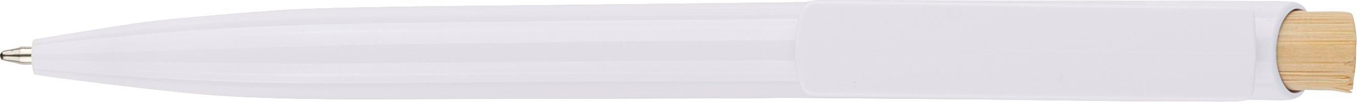 Penna a sfera in ABS riciclato, meccanismo a scatto in bambù e clip bianca, adatta per la stampa digitale, presenta logo materiale "riciclato" integrato nello stampo, lunghezza di scrittura circa 600 metri, refill blu.