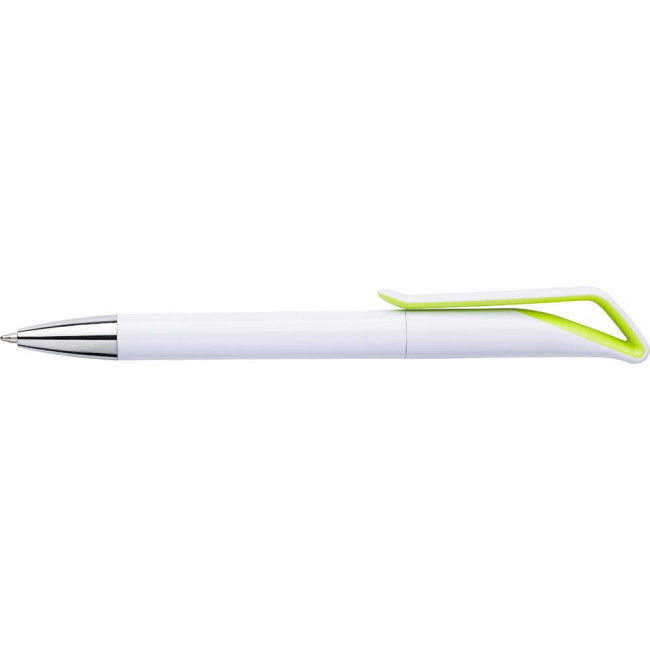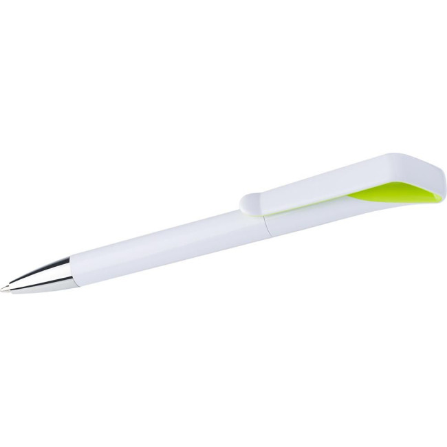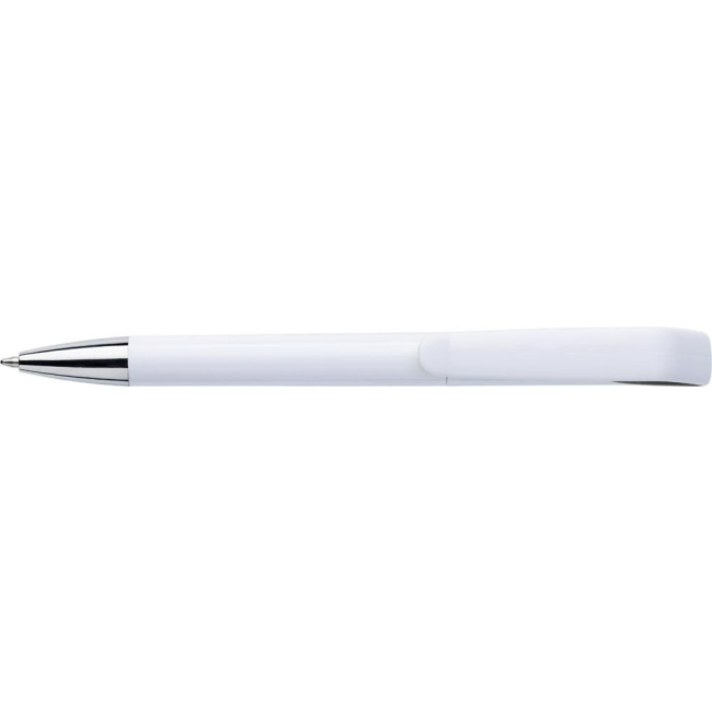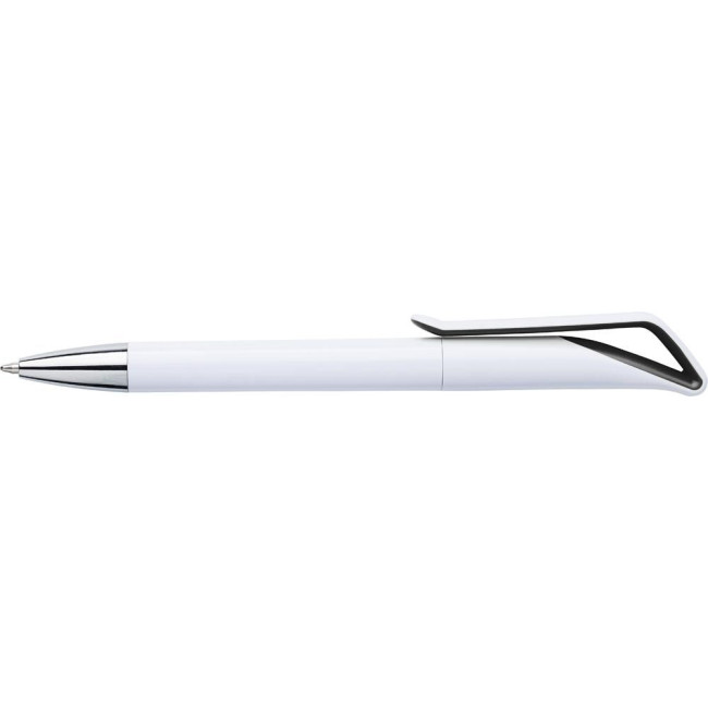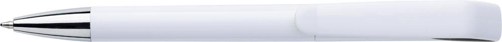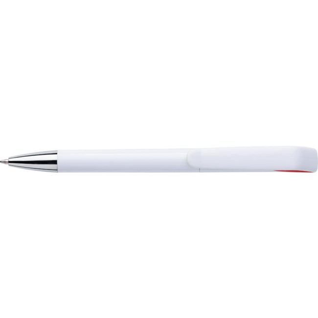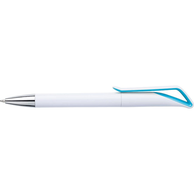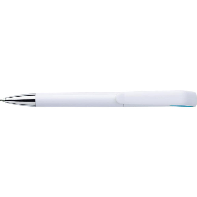 Penna a sfera geometrica in ABS, corpo bianco, finiture colorate, meccanismo a rotazione, puntale argentato, refill blu
