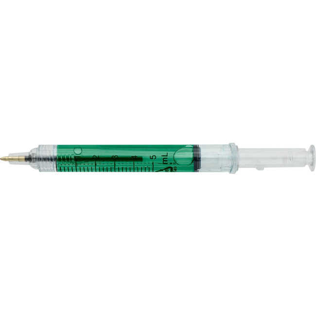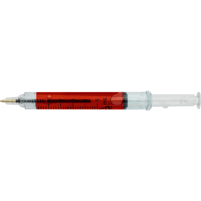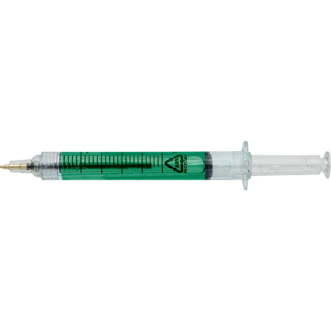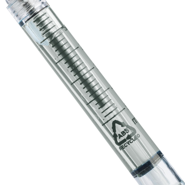 Penne a sfera progettate a forma di siringa, riempite con liquido colorato per un look giocoso e accattivante. Realizzate in ABS riciclato per ridurre gli sprechi di plastica mantenendo una forte durata. Dotate di meccanismo a pressione, refill nero, punta dello stilo capacitiva e logo in ABS riciclato stampato nello stampo.