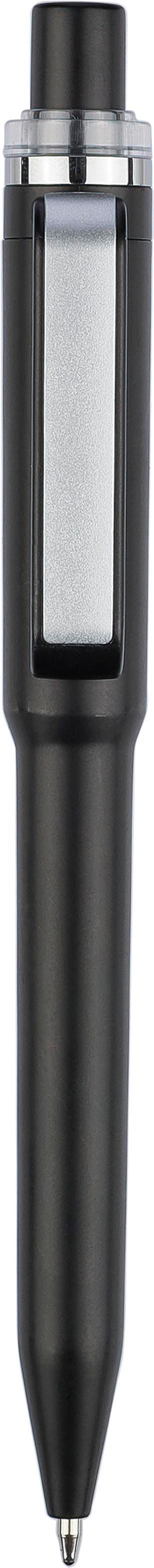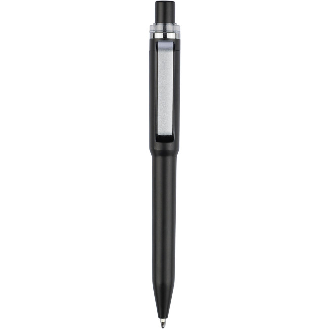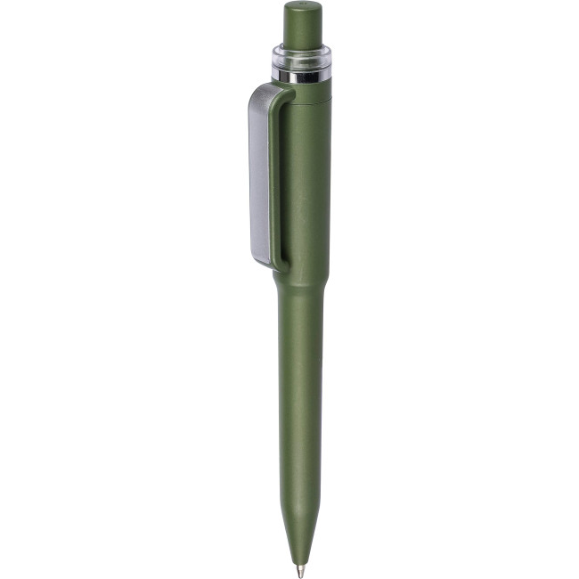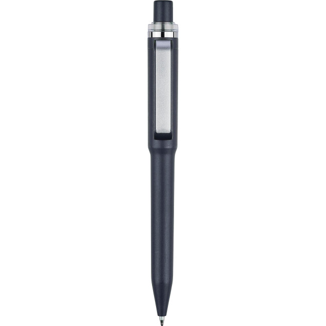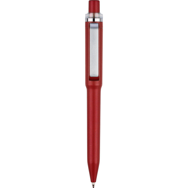 Penna a sfera in ABS riciclato progettata a forma di tazza da viaggio, con finitura metallica. Dotata di refill blu con una lunghezza di scrittura di 800 metri, meccanismo a pressione, tasto in plastica, clip e anello in plastica cromata sulla parte superiore. Include un logo in ABS riciclato stampato nel corpo.