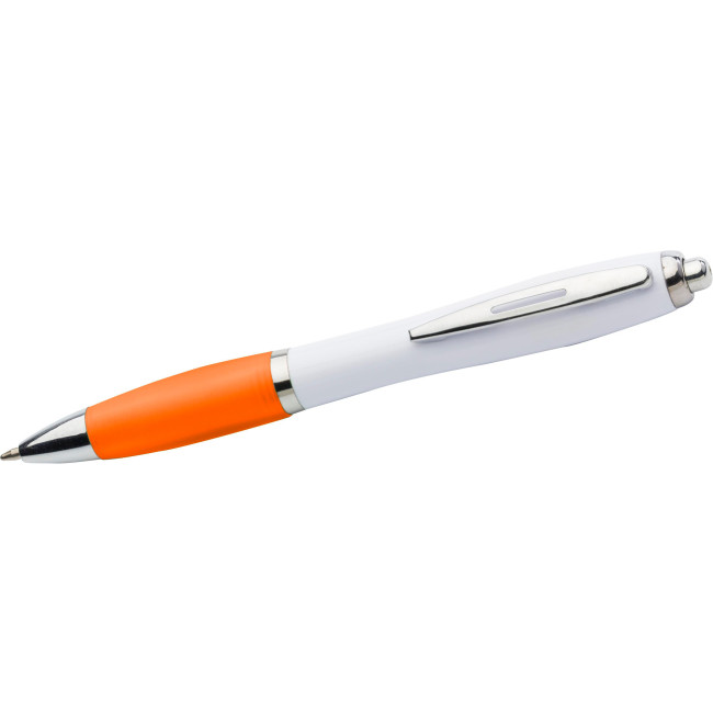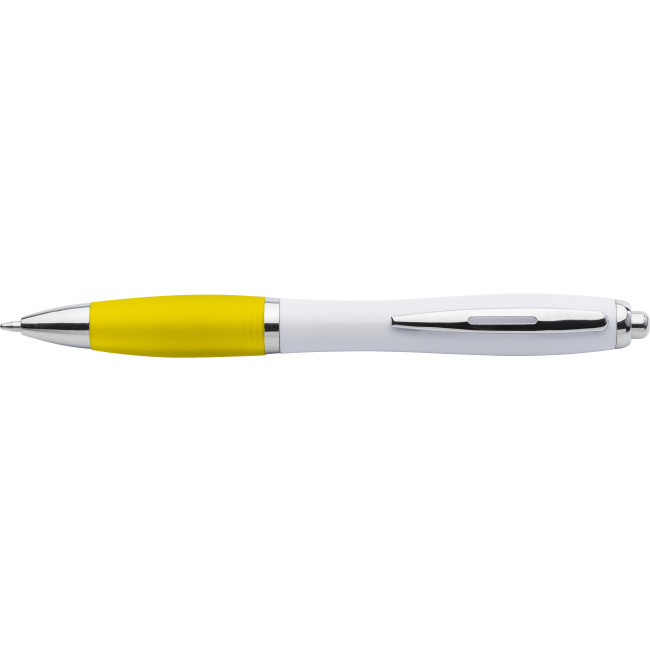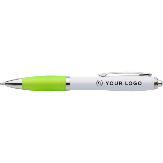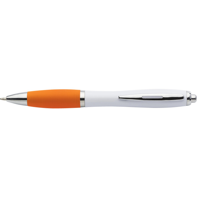 Penna a sfera in ABS, corpo bianco, impugnatura in gomma, refill blu