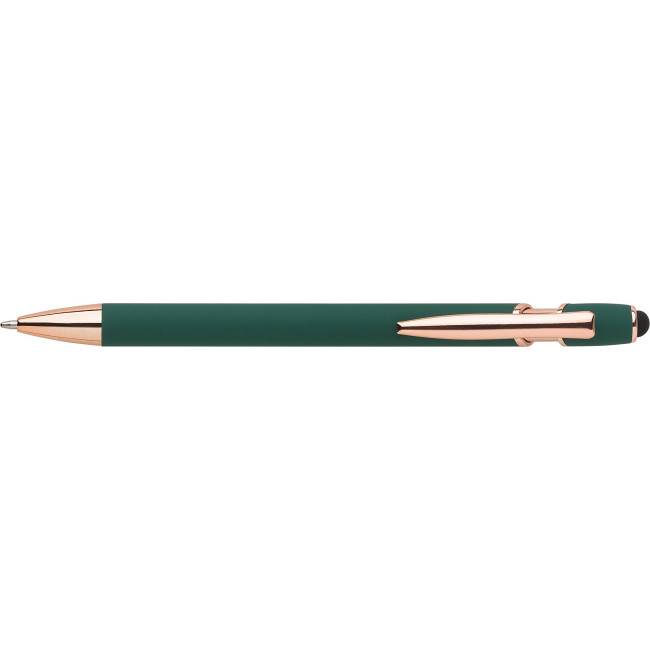 Penna a sfera in alluminio capacitiva (compatibile su schermi touch), dettagli color oro rosa, refill blu, una volta inciso, il logo emergerà in colore argento