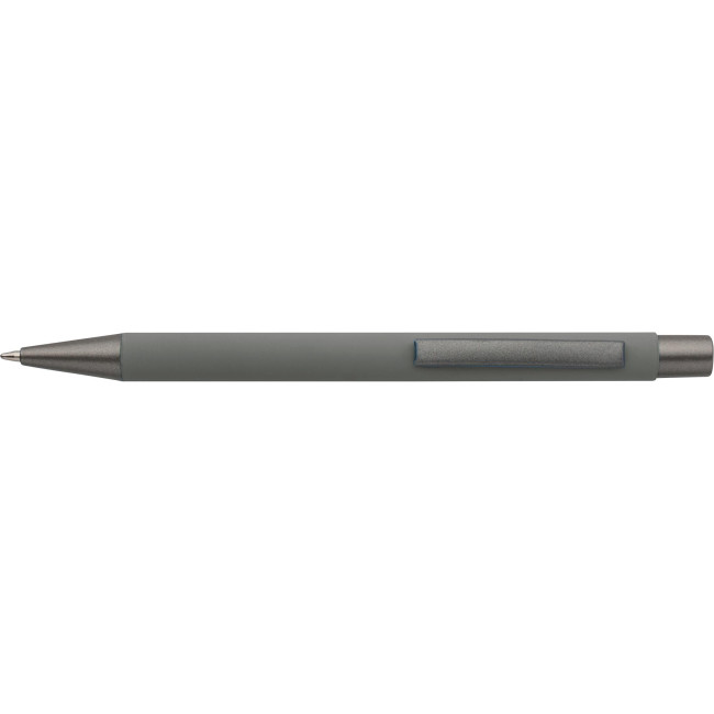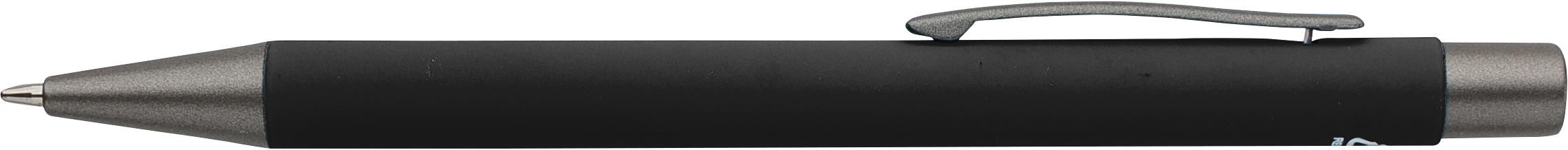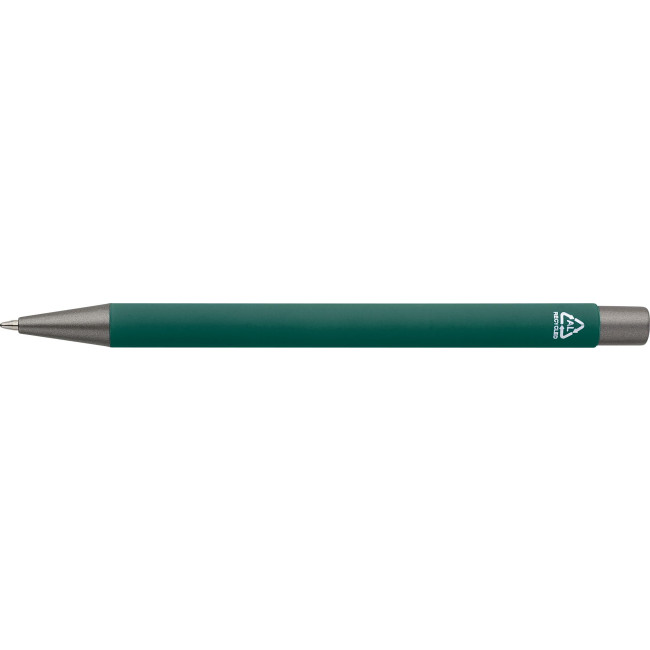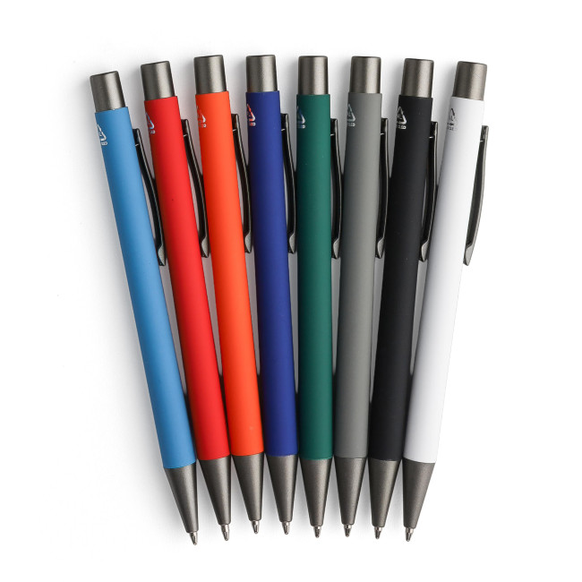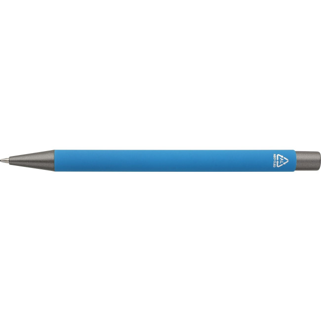Penne a sfera in alluminio riciclato con finitura in gomma morbida al tatto e refill blu. Progettate con dettagli grigio scuro e uno strato effetto specchio sotto il rivestimento per un risultato inciso sorprendente. Dotate di meccanismo a pulsante e rifinite con logo riciclato inciso.