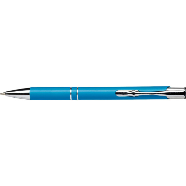 Penna a sfera in alluminio riciclato, corpo colorato, due anelli decorativi, punta e clip in metallo, refill blu