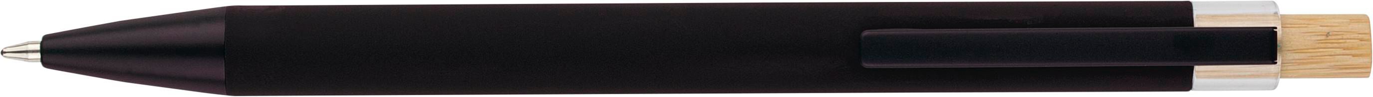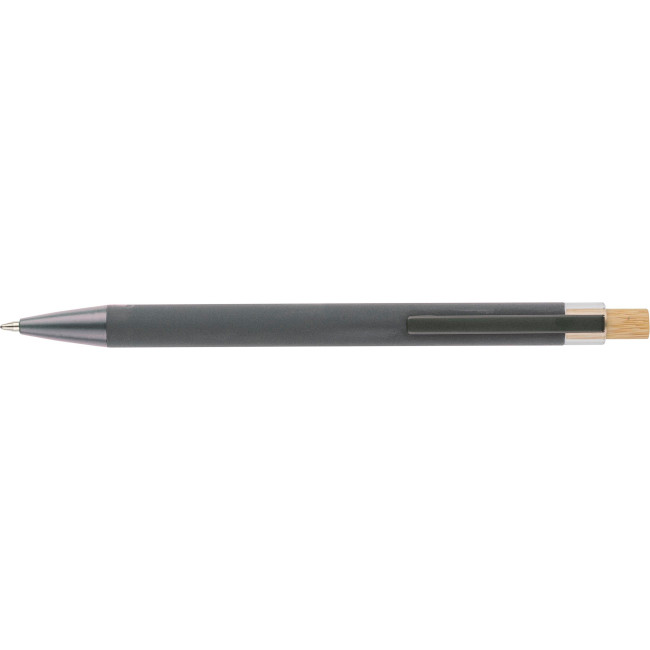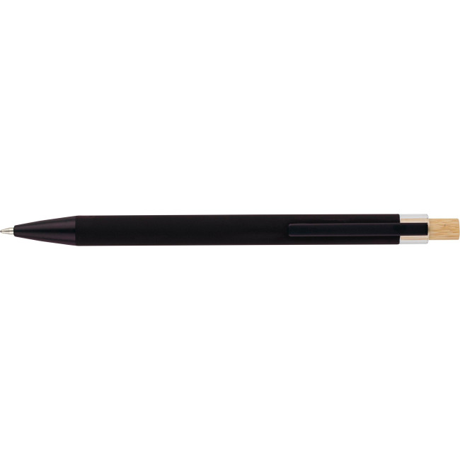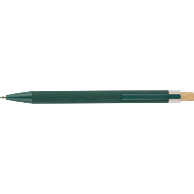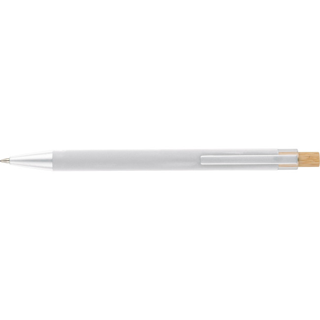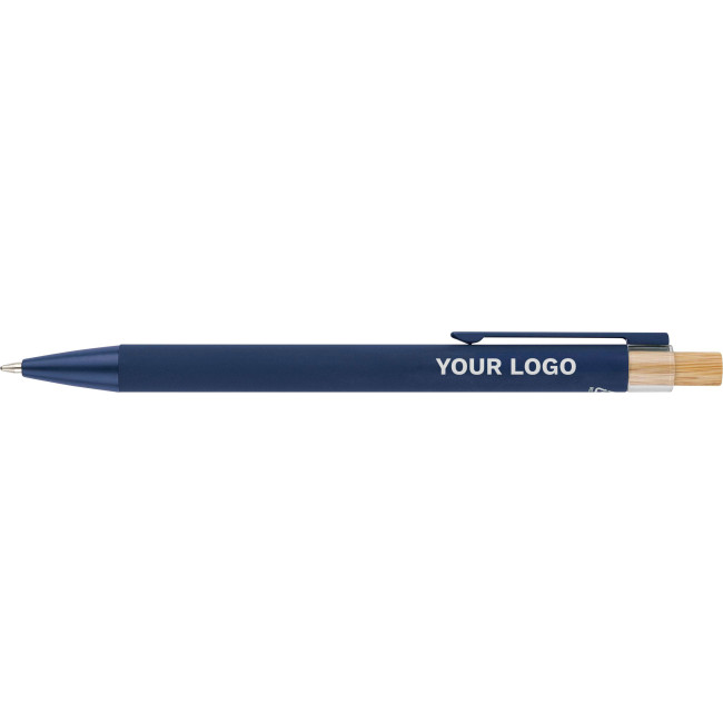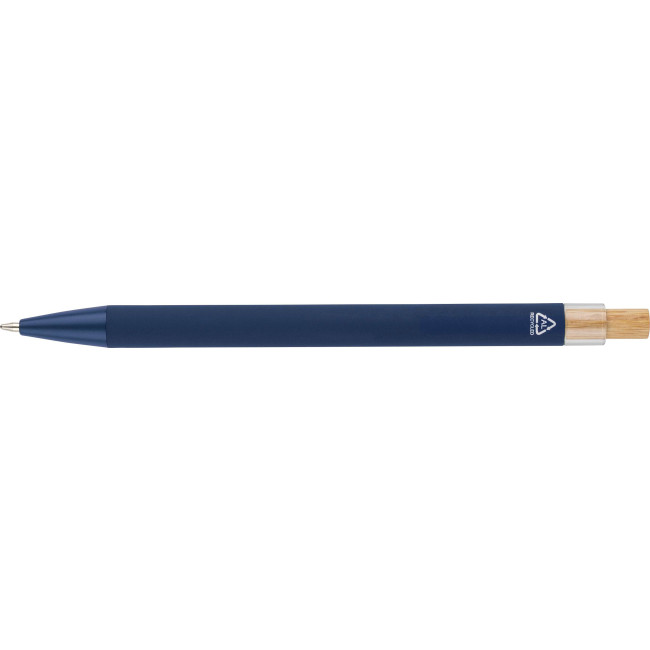 Penna a sfera in alluminio riciclato con pulsante a pressione in bambù e dettaglio in plastica AS, include clip metallica e punta in plastica, entrambe nei colori coordinati, logo "riciclato" inciso al laser sul corpo, lunghezza di scrittura approssimativa 800?metri, refill blu