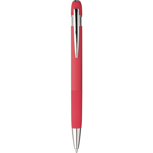 Penna a sfera in alluminio riciclato con finitura gommata, presenta dettagli a strisce sull’impugnatura e sulla parte superiore, punta in plastica cromata, meccanismo a scatto, clip in metallo, refill blu, include logo materiale riciclato inciso al laser.