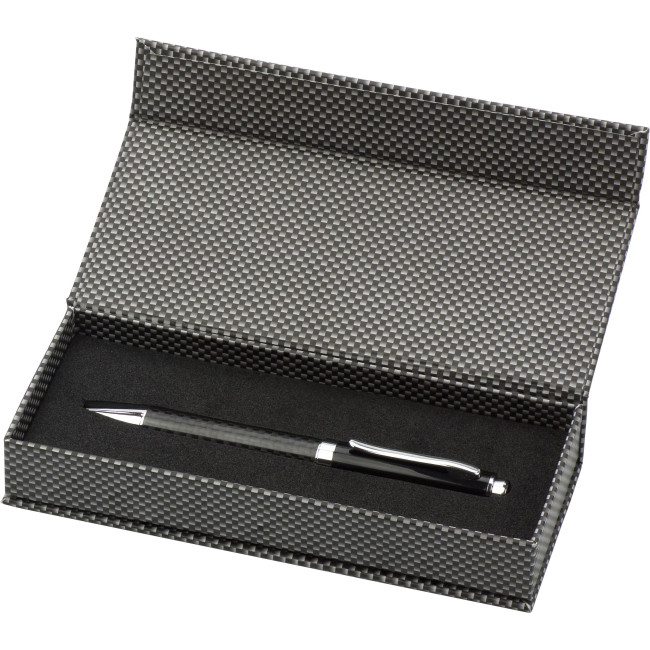Penna a sfera a rotazione, corpo in carbonio, astuccio in cartone con chiusura magnetica, refill nero