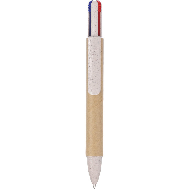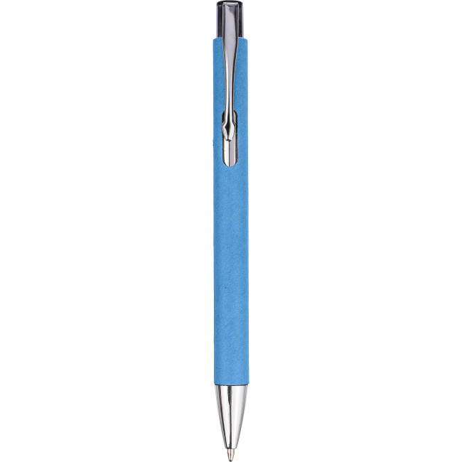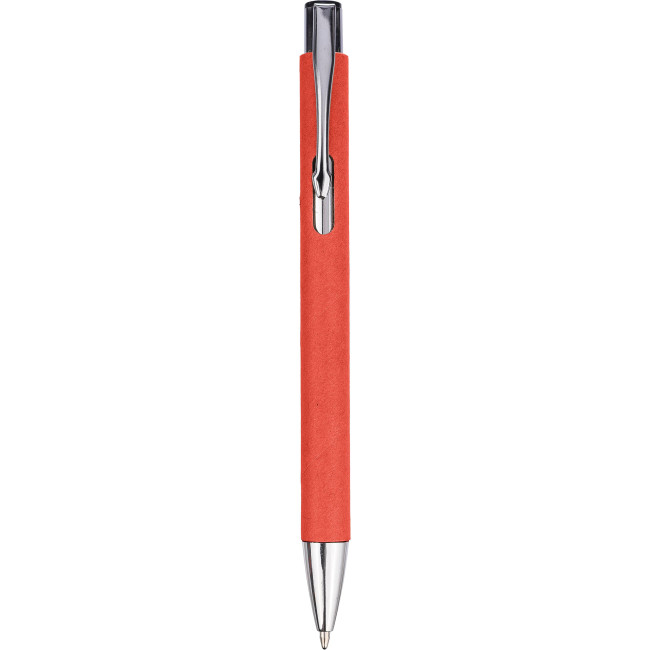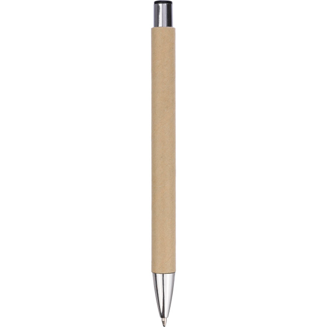 Penna a sfera in cartone riciclato con dettagli cromati, punta e pulsante in plastica, clip in metallo, lunghezza di scrittura di circa 800 metri, refill nero
