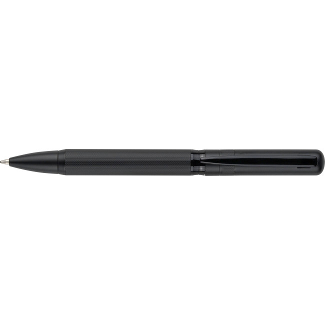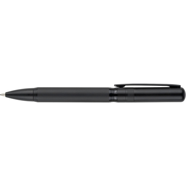 Penna a sfera twist in ottone riciclato, con clip in metallo coordinata al colore e meccanismo a rotazone, dotata di inchiostro German Ink Dokumental, lunghezza di scrittura di circa 1.000 metri, confezionata singolarmente in scatola scorrevole nera, refill blu.