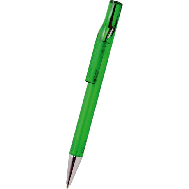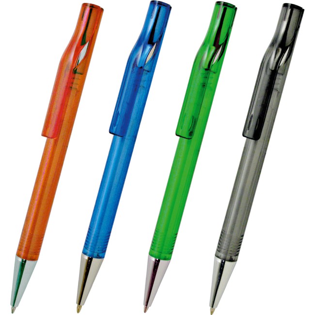 Penna sfera plastica colorata. Meccanismo a scatto. Particolari silver. Refil blu ink 1.0 mm.