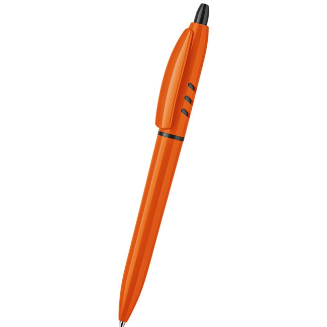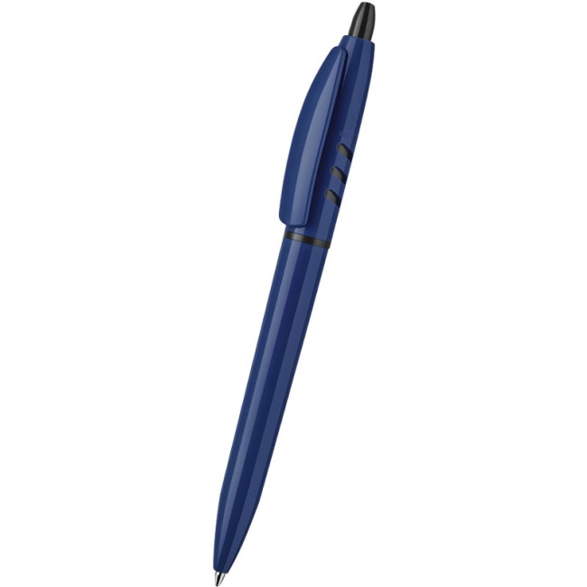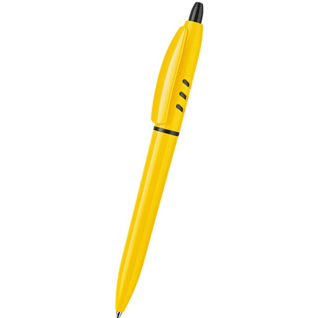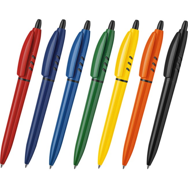 Penna sfera a scatto, fusto plastica colorato, rifiniture nere. Refil blu.