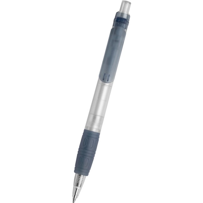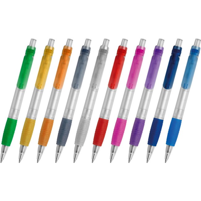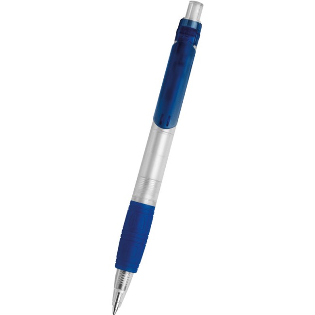 Penna sfera a scatto, fusto plastica trasparente, rifiniture colorate. Refil blu.