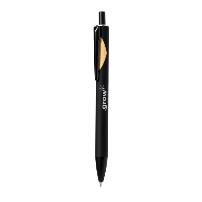 Penna a pulsante con fusto nero e dettagli in bambù per stampa laser
