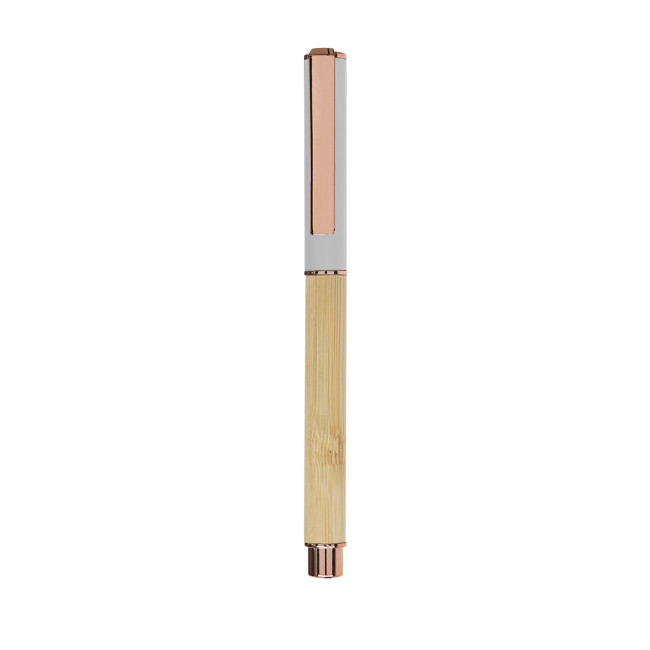 Penna roller Bobbin realizzata in bambù, caratterizzata da un corpo elegante e dettagli in alluminio. La clip in metallo e l'impugnatura cromata in oro rosa conferiscono un tocco di classe. Con cartuccia jumbo e inchiostro blu, è ideale per chi cerca un accessorio di scrittura raffinato.