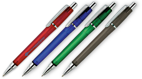 Penna sfera a scatto fusto frost, in plastica finiture colorate. Refil blu. Confezione in polybag.