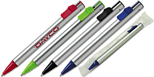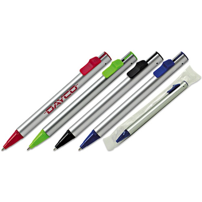 Penna sfera a scatto fusto in plastica in silver finiture verdi refil nero