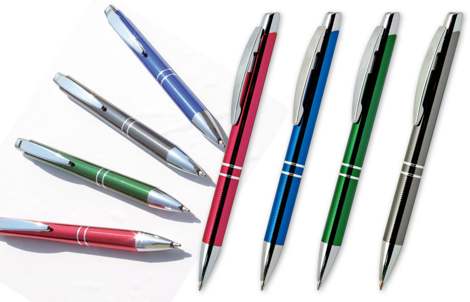 Penna a sfera a scatto realizzata in alluminio colorato, con particolari cromati che ne esaltano il design. Dotata di meccanismo a scatto e refil blu da 1.0 mm, offre una scrittura fluida e precisa. Un accessorio pratico e funzionale per ogni scrivania.