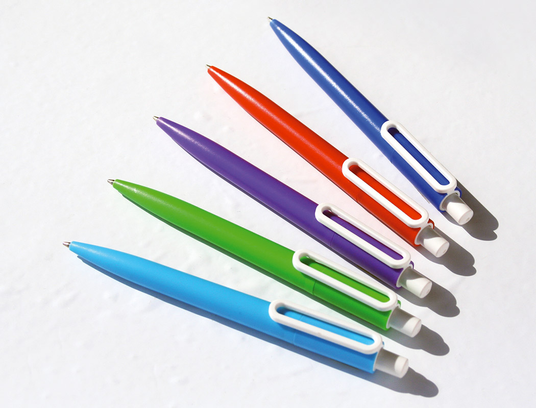 Penna a sfera in plastica colorata con clip bianca e refill blu. Il design semplice e funzionale la rende adatta per l'uso quotidiano, garantendo una scrittura fluida e precisa.