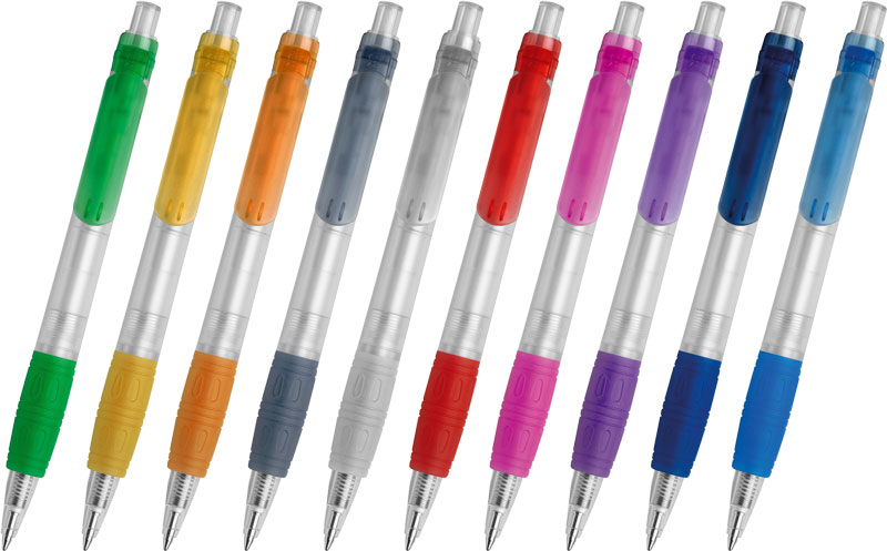 Penna a sfera a scatto con fusto trasparente e rifiniture colorate
