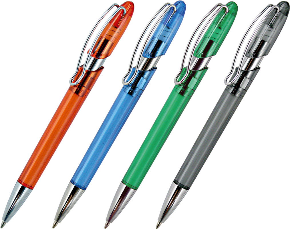 Penna a sfera a scatto in plastica trasparente colorata con particolari cromati