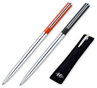 Penna a sfera "You Young" slim a rotazione, caratterizzata da un fusto in metallo cromato e laccato. Presentata in una confezione in similpelle nera, è un accessorio pratico e raffinato per la scrittura quotidiana.