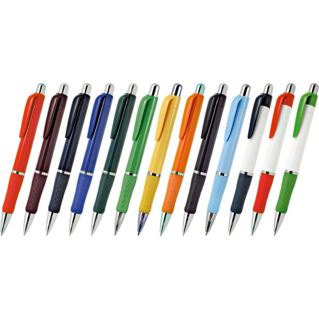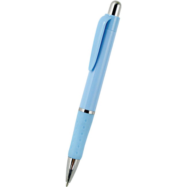 Penna in plastica impugnatura in gomma particolari cromati. Meccanismo a scatto. Refil blu 1.0 mm.