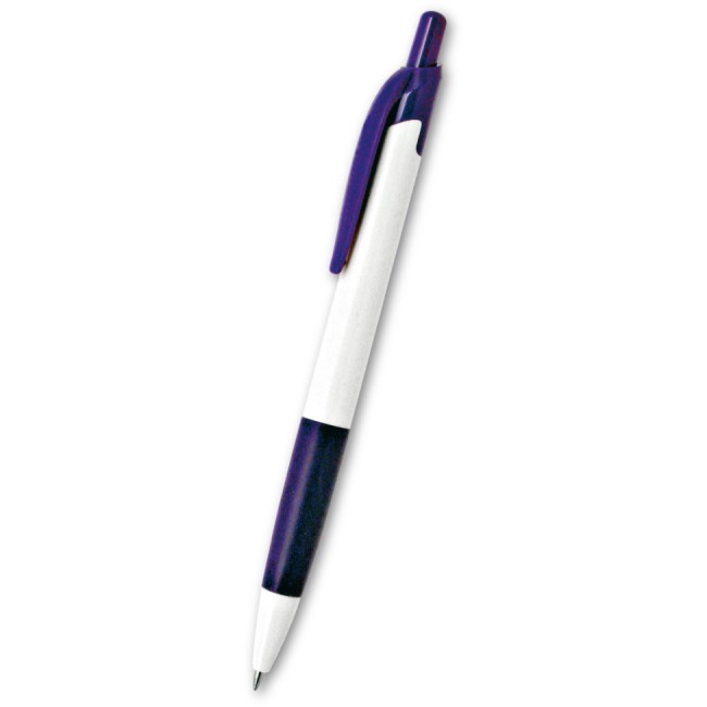 Penna sfera a scatto fusto in plastica bianca, clip colorata, impugnatura in gomma colorata, refil nero. Punta TC.
