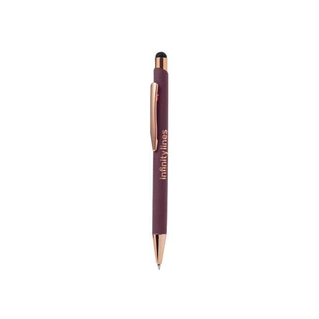 Penna touch in gomma progettata per la stampa laser, dotata di meccanismo a pulsante e clip in metallo. Disponibile in quattro colori, presenta inchiostro blu e cartuccia Jumbo, ed è presentata in un'elegante scatola nera di design, perfetta per un uso professionale.