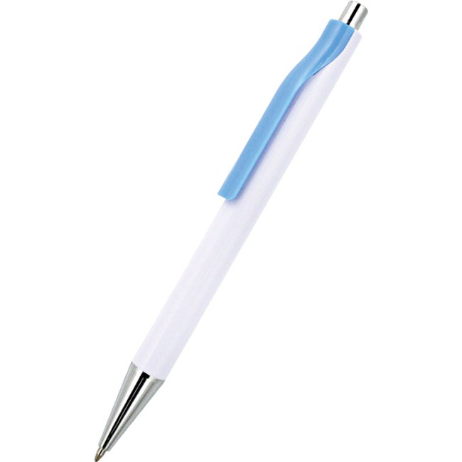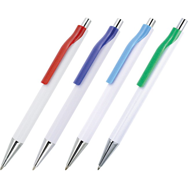 Penna sfera a scatto, plastica bianca, clip colorata, particolari silver. Refil blu.