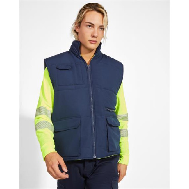 Gilet reversibile multitasche alta visibilità con collo alto.Gilet multitasche.· Cerniera centrale con tiretto reversibile.· Una tasca esterna per cellulare sul lato destro.· Due tasche frontali con soffietto e spacchi laterali.· Due spazi per penne.· Tasca con cerniera.· Giacca a vento sulle maniche.· Orlo posteriore con gonna.· Regolatore elastico.Gilet alta visibilità· Colore fluorescente.· Due nastri riflettenti orizzontali.