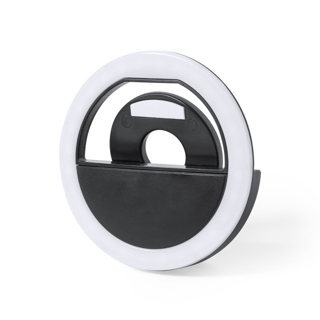 Luce ad anello a LED con supporto per smartphone, realizzato in ABS resistente. 28 LED, con 3 livelli di intensità e ricaricabile via USB (cavo Micro USB incluso). Confezionato in una scatola dal design accattivante. Manuale disponibile in inglese e spagnolo.