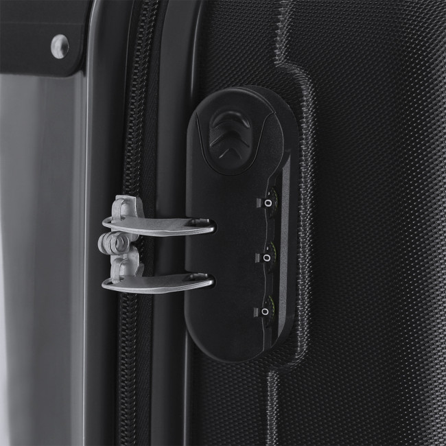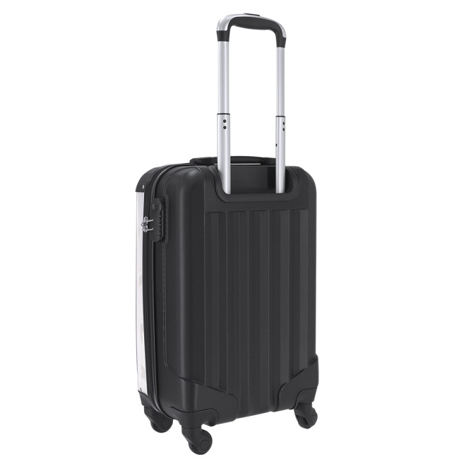 Trolley ideale per la personalizzazione con design proprio. Dotato di protezione frontale trasparente in PC, che permette di inserire facilmente il design desiderato, garantendo la massima visibilità. Parte posteriore in resistente ABS nero, che offre robustezza e durabilità. Con chiusura laterale di sicurezza a combinazione e doppio tiratore sulle cerniere. Allinterno dispone di scomparto con cerniera e cinghie di fissaggio. Con manico telescopico e 4 ruote girevoli.