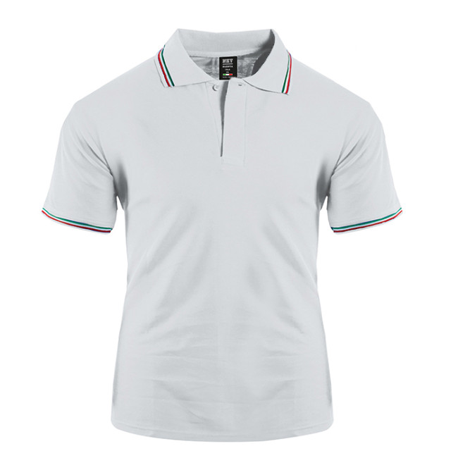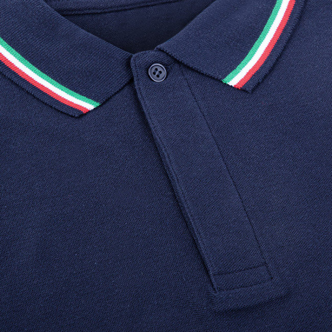 polo mezza manica cotone con profili tricolore 2 bottoni di cui 1 a scomparsa collo e giromanica a costina rinforzata ribattitura doppio ago su collo, maniche e orlo nastro di rinforzo interno spacchi laterali colori reattivi 180 g/m2