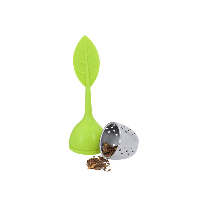 Infusore per tè con design a foglia, realizzato in silicone e acciaio inox. Include base in silicone.