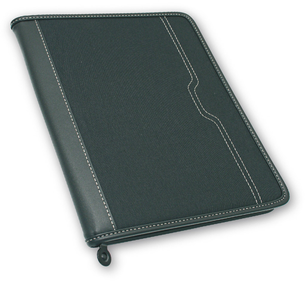 Portablocco A5 realizzato in poliestere 600D, dotato di chiusura a cerniera nera e supporto tablet. Include un blocco carta da 25 fogli a righe, rendendolo un accessorio versatile per chi cerca funzionalità e praticità in un unico prodotto.