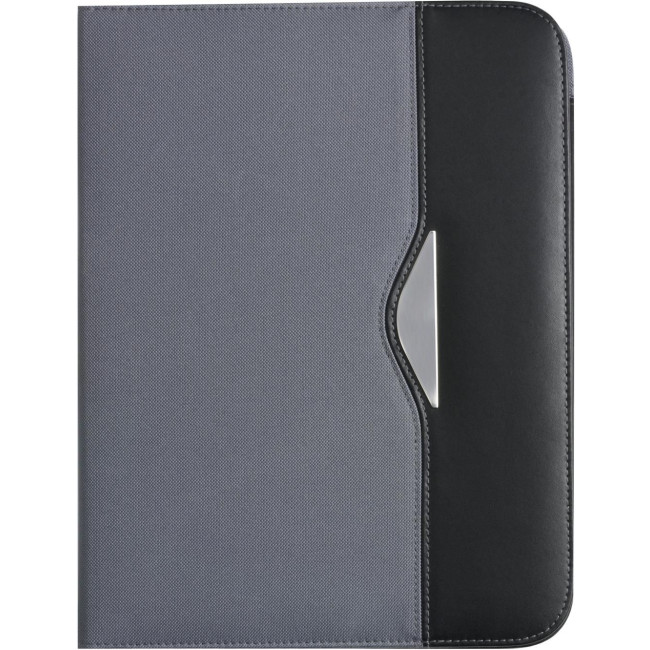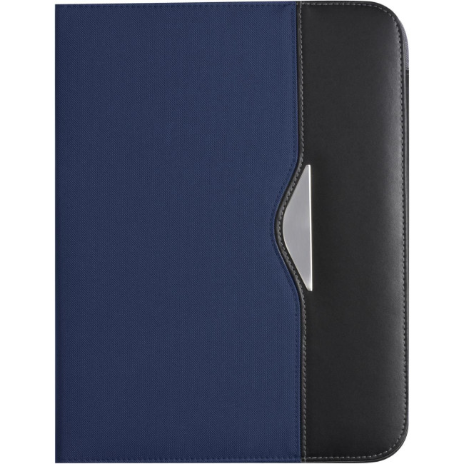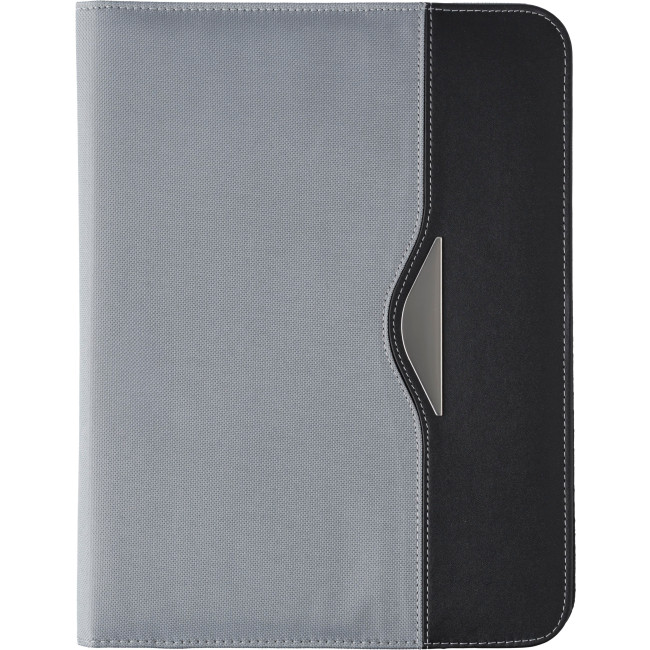 Portablocco formato +/- A4, scomparto grande sul lato sinistro, vano portabiglietti, passante elasticizzato per penna targhetta in metallo, blocco incluso, in nylon 600 D