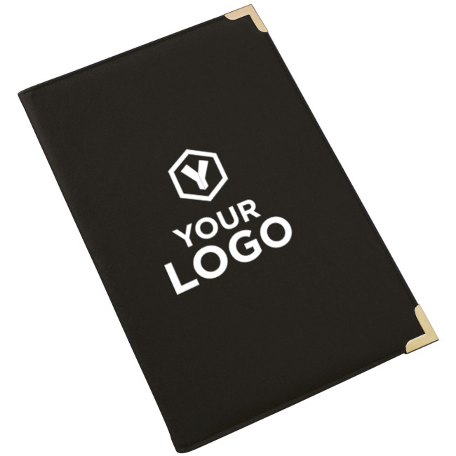 Cartella portadocumenti in PU formato +/- A4, angoli in metallo, varie tasche, penna e blocco per appunti esclusi. Si prega di considerare che la versione blu ha angoli argentati, mentre quella nera ha angoli dorati.