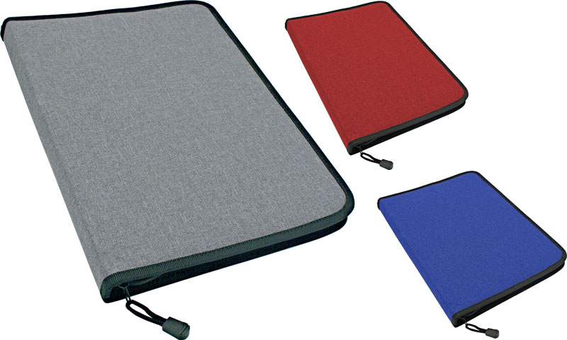 Portablocco realizzato in poliestere 600D di colore grigio melange, con bordo nero e chiusura a cerniera. Include un'asola portapenne per una maggiore praticità. Questo prodotto è ideale per chi cerca un accessorio resistente e funzionale per l'ufficio o lo studio.