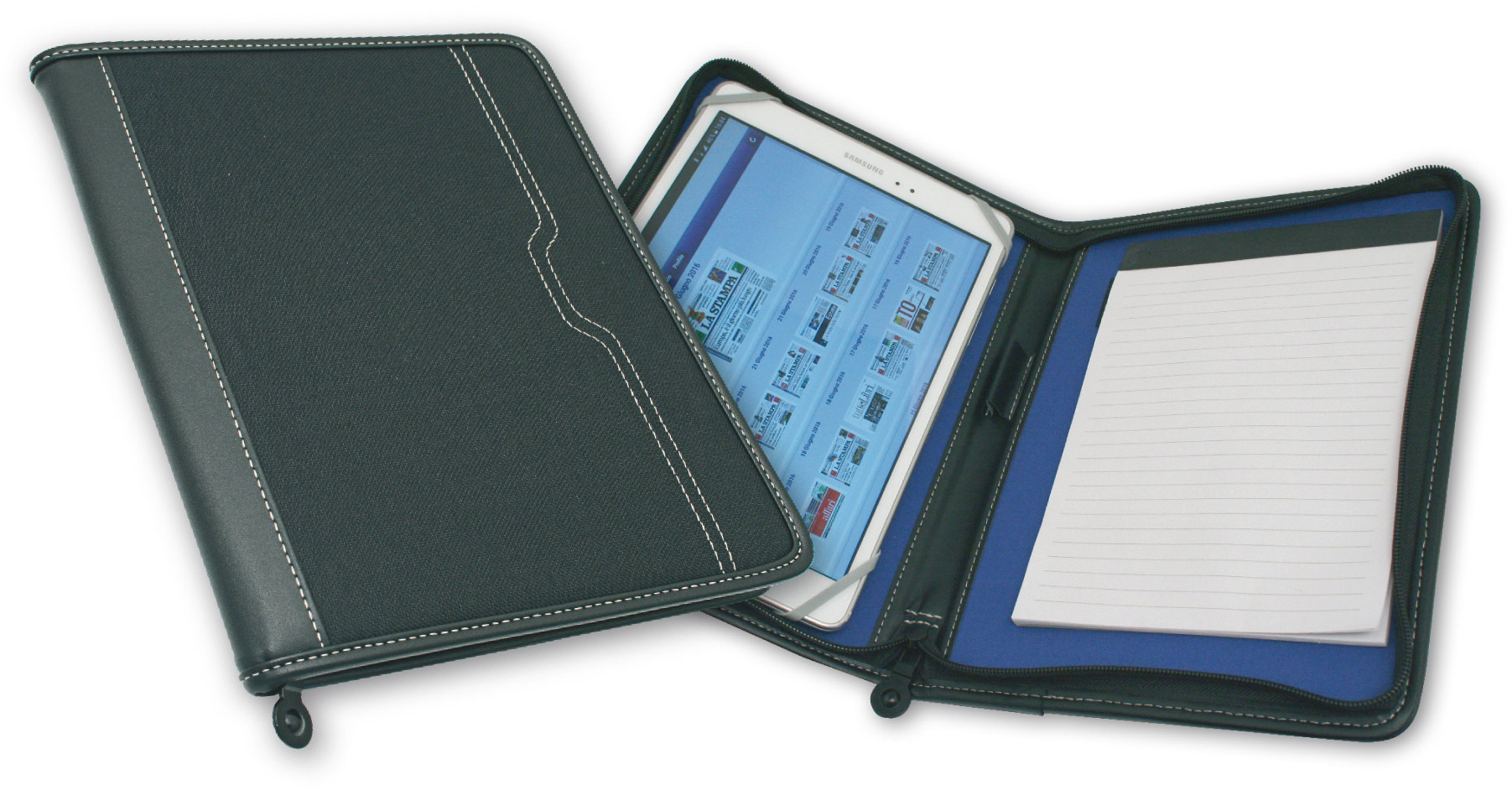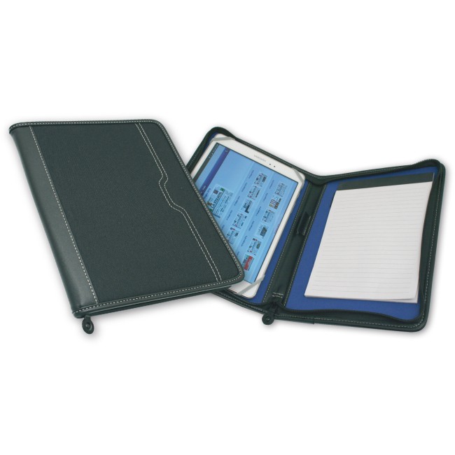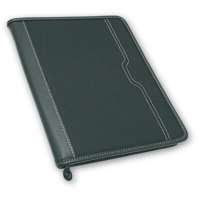 Portablocco A5 poliestere 600D, cucitura perimetrale grigia, chiusura con cerniera nera, asola per penna non fornita, supporto tablet, blocco carta da 25 fg. a righe.