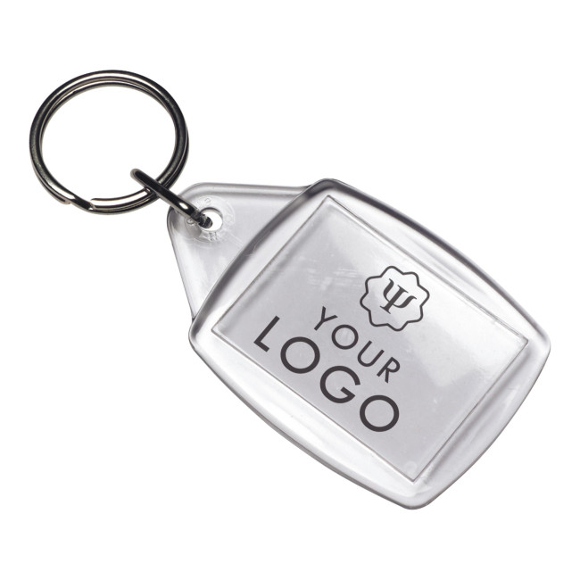 Portachiavi portafoto/logo trasparente. La stampa sarà eseguita su un inserto in carta.