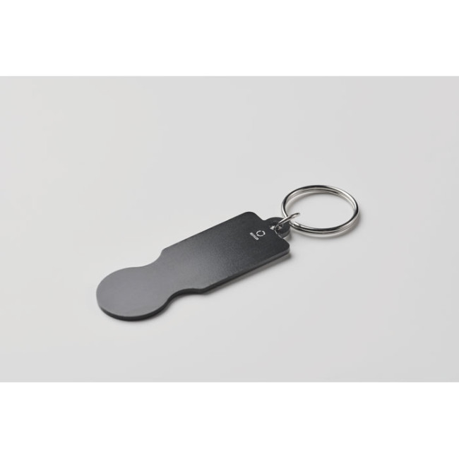 Portachiavi con gettone in alluminio riciclato, un accessorio pratico e sostenibile per tenere le chiavi in ordine. Questo portachiavi è facilmente personalizzabile, rendendolo un'ottima scelta per eventi aziendali e regali promozionali.