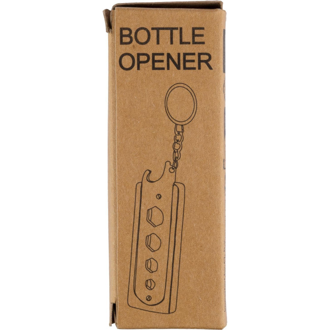 Portachiavi in bambù con funzione apribottiglie, include 4 chiavi inglesi all’interno, confezionata singolarmente in una scatola in cartone avana con disegno ad 1 colore