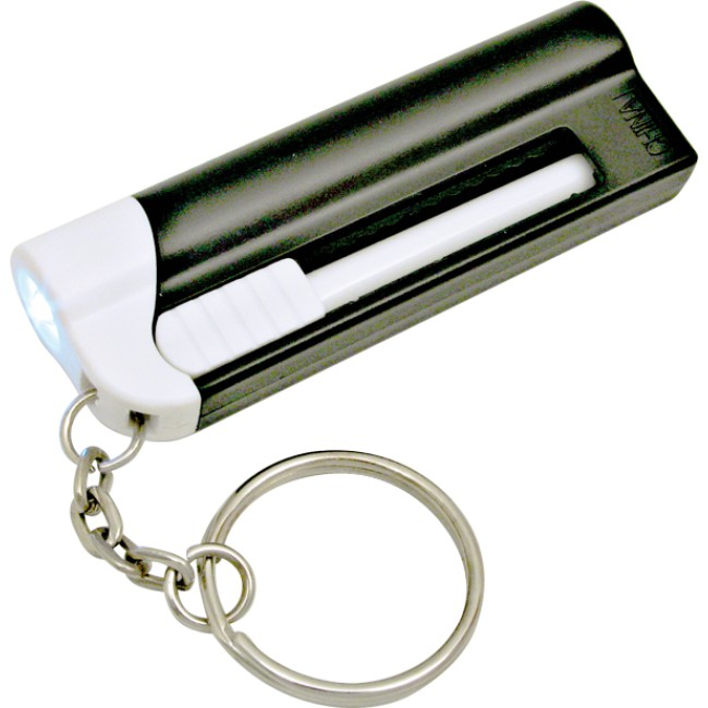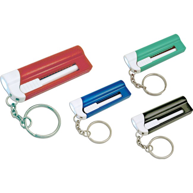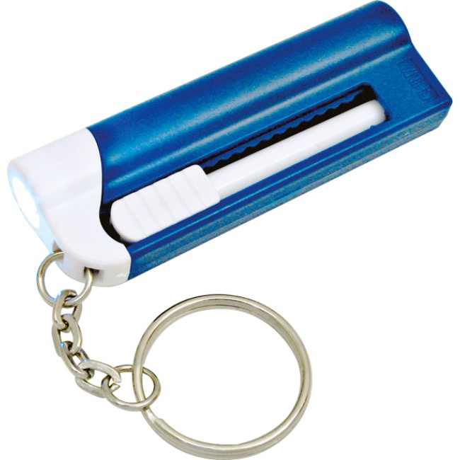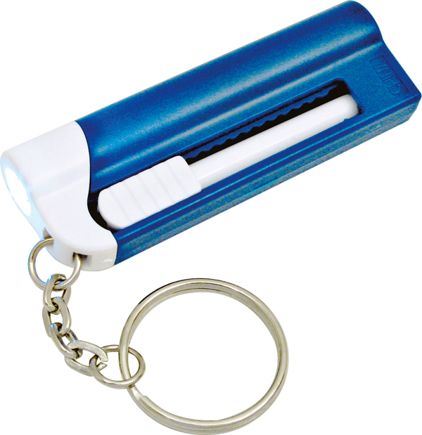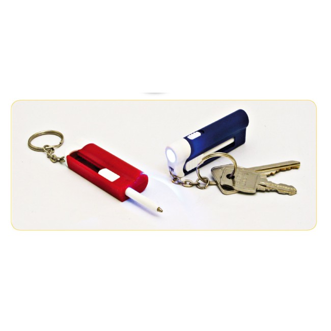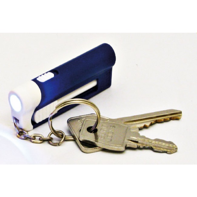 Portachiave plastica blu, dotato di luce e pratica penna a scomparsa.