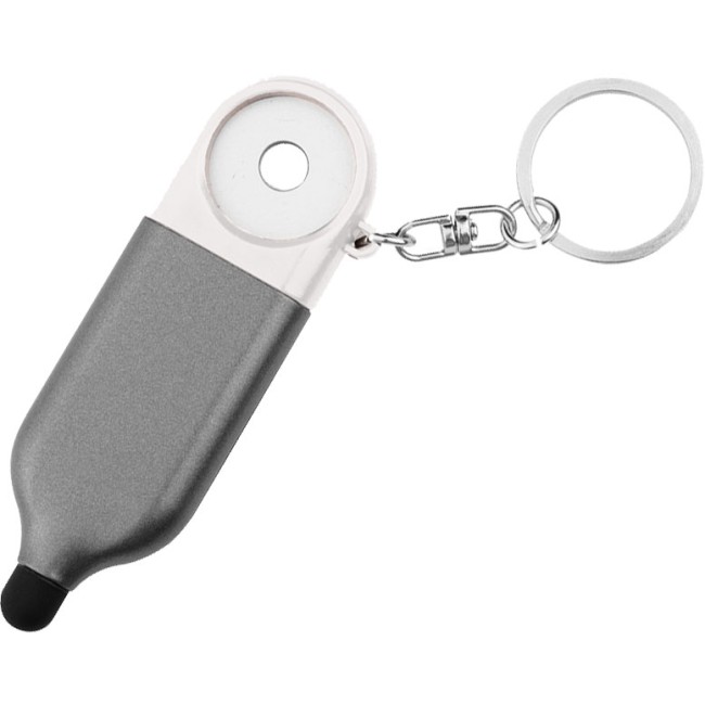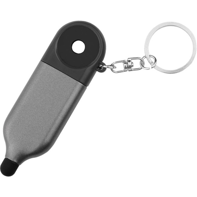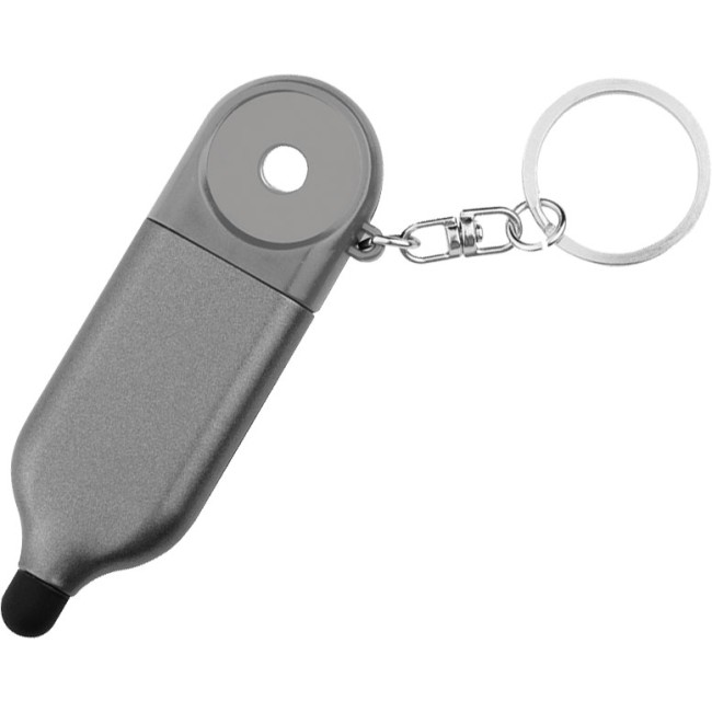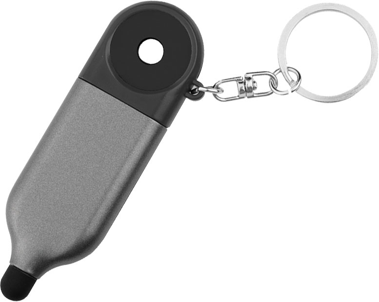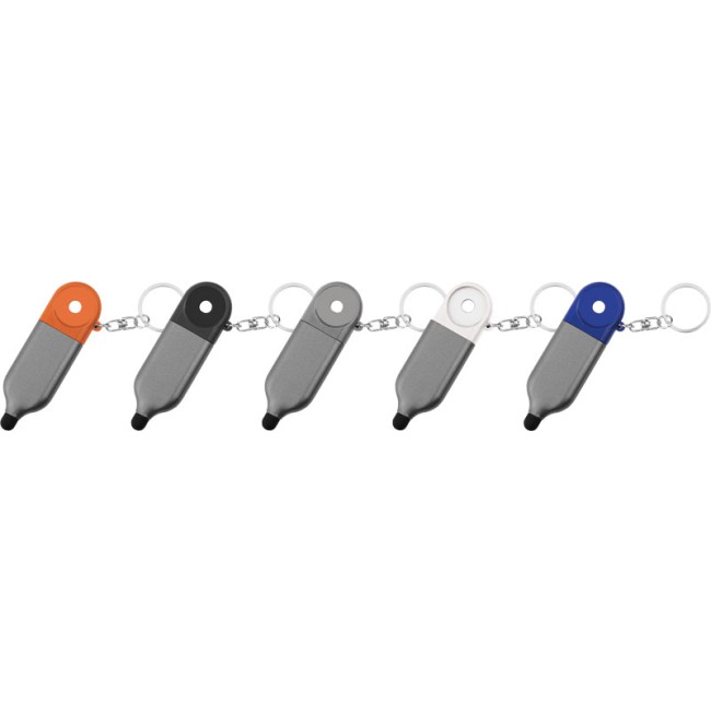 Portachiavi con gommino per touch screen, gettone per il carrello spesa, mini penna refil nero, anello piatto in metallo cromato.